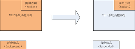 2、程序配置用于 VOIP 業(yè)務(wù)的網(wǎng)絡(luò)連接(Socket),告知系統(tǒng),在程序進(jìn)程被調(diào)度到“掛起(Suspended)”狀態(tài)時(shí)該特殊的網(wǎng)絡(luò)連接需要被系統(tǒng)接管,因此,此時(shí)網(wǎng)絡(luò)連接仍然是活動的。當(dāng)網(wǎng)絡(luò)連接有新的數(shù)據(jù)到達(dá)的時(shí)候,程序?qū)摹皰炱穑⊿uspended)” 狀態(tài)被喚醒到“后臺 (Background)”狀態(tài),如果是個(gè)來電事件,VOIP應(yīng)用則發(fā)起一個(gè)本地提醒事件,此時(shí)用戶可以在設(shè)備的界面上看到來電提醒,如果用戶選擇接聽來電,則 VOIP 應(yīng)用被調(diào)度到前端的“活動 (Active)”狀態(tài)直接與用戶交互,否則,回退到低電的“掛起(Suspended)”狀態(tài)。下圖可以看到左圖是傳統(tǒng)的 VOIP 應(yīng)用,在“待機(jī)”狀態(tài)下整個(gè)程序都運(yùn)行在耗電的“后臺 (Background)”狀態(tài),右圖是蘋果的 VOIP 實(shí)現(xiàn),僅僅網(wǎng)絡(luò)連接運(yùn)行在耗電的“后臺 (Background)”狀態(tài)。其余系統(tǒng)部分運(yùn)行在低電的“掛起(Suspended)”狀態(tài)。