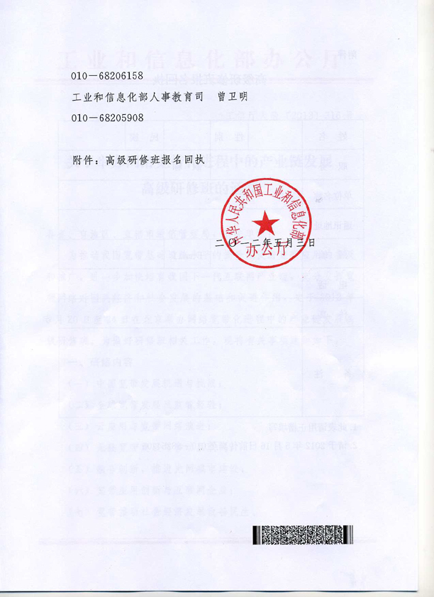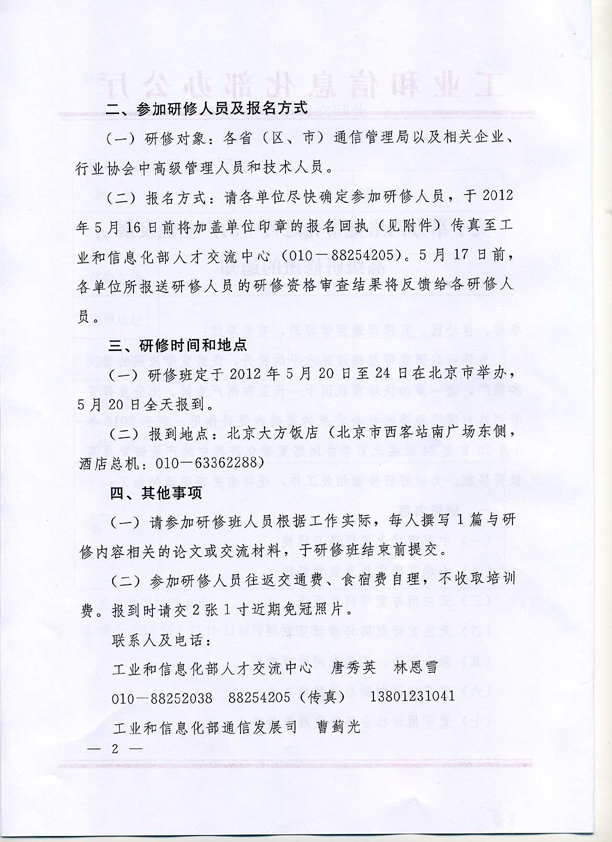 報(bào)名方式:請各單位盡快確定參加研修人員,于2012年5月16日前將加蓋單位印章的報(bào)名回執(zhí)(附后)傳真至工業(yè)和信息化部人才交流中心(010-88254205)。5月17日前,各單位所報(bào)送研修人員的研修資格審查結(jié)果將反饋給各研修人員。