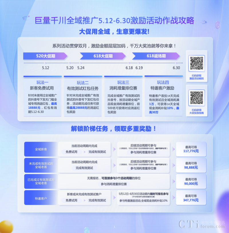 在此次巨量千川618好物節(jié)期間,全域推廣系列活動(dòng)貫穿雙月,激勵(lì)金額層層加碼,更有多重獎(jiǎng)勵(lì),獎(jiǎng)池金額累積千萬(wàn)。全域推廣針對(duì)全域新客發(fā)放高達(dá)18888元的全域推廣專屬紅包;對(duì)于未完成全域有效測(cè)試的商家在活動(dòng)期完成有效測(cè)試任務(wù)可獲得最高28888元的消返紅包;以及參與全域推廣消耗排位賽,最高可得50000元消返紅包;對(duì)于特邀客戶首投14天完成有效測(cè)試且全域消耗滿1萬(wàn),可獲得14天全域現(xiàn)金消耗補(bǔ)貼10%,最高達(dá)30萬(wàn)。