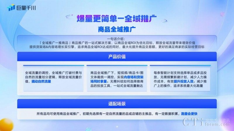 此外,商品全域推廣為商品推廣提供一站式解決方案,是以商品全域ROI為優(yōu)化目標(biāo),釋放全域流量帶來(lái)的增效價(jià)值,提供貨架場(chǎng)、內(nèi)容場(chǎng)增長(zhǎng)雙引擎,幫助客戶在追求商品全域ROI達(dá)成的同時(shí),最大化提升商品交易額,更好的滿足客戶的實(shí)際經(jīng)營(yíng)目標(biāo)。在商品全域推廣下,短視頻/商品卡/圖文體裁統(tǒng)一調(diào)控,無(wú)需糾結(jié)選擇推廣商品的投放工具,一站式全域流量觸達(dá)。