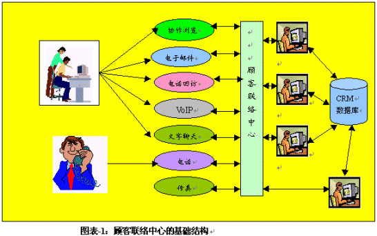 。。呼叫中心通過多年以來的發(fā)展,其傳統(tǒng)型的呼叫中心還是主要在以電話為媒介服務(wù)于顧客。這類呼叫中心的基礎(chǔ)結(jié)構(gòu)包括ACD、IVR、CTI等技術(shù)應(yīng)用平臺和界面,同時(shí)與企業(yè)的后臺資源相連接,例如大型或相關(guān)數(shù)據(jù)庫。但是,當(dāng)今的呼叫中心已經(jīng)發(fā)展成為一個(gè)多媒體的服務(wù)或交易渠道,有的還能處理基于互聯(lián)網(wǎng)的垂詢和呼叫,而有的則是一個(gè)虛擬的顧客聯(lián)絡(luò)中心,例如圖表-1中描述的那樣: