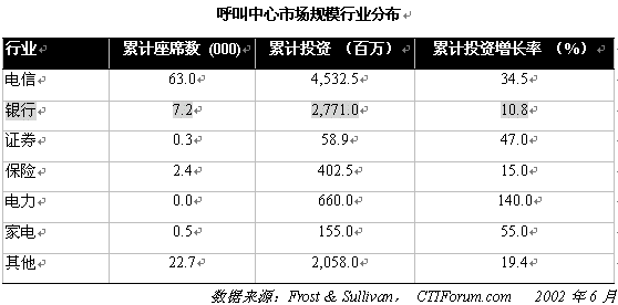 。。中國呼叫中心市場規(guī)模難于確定。根據(jù)CTIForum 的統(tǒng)計(jì)數(shù)字,截止到2001年,中國呼叫中心座席總數(shù)達(dá)到96,200個(gè),市場規(guī)模達(dá)到106.38億元,分別較去年同期增長51.6%,55.2%。2001年,中國呼叫中心市場規(guī)模在各行業(yè)中的分布如下表所示: