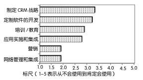 通常,通信提供商相對而言不愿意求助于專業(yè)服務(wù)公司來幫助其實施CRM解決方案。在1~5的標(biāo)尺中,只有積分為5的公司可能使用專業(yè)服務(wù)公司,分數(shù)低于3.5的公司沒有一家會這么做,這表明通信提供商仍由內(nèi)部人員來實施多數(shù)功能。調(diào)查的分數(shù)表明他們最可能與外部服務(wù)提供商合作制定戰(zhàn)略——定制軟件開發(fā)(3.33)和培訓(xùn)(3.22)。他們最不可能求助此類公司來從事網(wǎng)絡(luò)管理和集成(1.89)或營銷(1.89)工作。圖3顯示的就是這些調(diào)查結(jié)果。