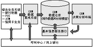 銀行CRM系統(tǒng)一般由業(yè)務處理、客戶聯(lián)系和客戶關系分析中心三部分組成。業(yè)務處理部分指銀行的綜合業(yè)務處理系統(tǒng),包括柜面業(yè)務系統(tǒng)、信用卡系統(tǒng)、POS機和ATM機等;客戶聯(lián)系部分由呼叫中心和網上銀行組成;客戶關系分析中心則以CRM中心數據倉庫為核心,通過數據集成系統(tǒng)與業(yè)務處理部分連接,同時為銀行的管理層和業(yè)務分析人員提供客戶分析系統(tǒng)。