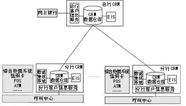 由于銀行在各地建有大量的分支機構,銀行CRM系統(tǒng)一般都采用分布式數據倉庫環(huán)境,即所有分行均擁有自己的CRM系統(tǒng),并與本地綜合業(yè)務系統(tǒng)及呼叫中心連接。在總行建有中心CRM數據倉庫,提供面向全行的分析決策功能,并為網上銀行業(yè)務提供數據查詢支持。