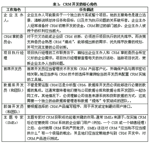 表1列出了CRM開發(fā)團(tuán)隊(duì)中的核心工作功能。在開始著手一個(gè)開發(fā)項(xiàng)目之前,確保已經(jīng)考慮了下面的每一種角色;并且從公司內(nèi)部和外部來理解勝任這些角色所必需的技能。