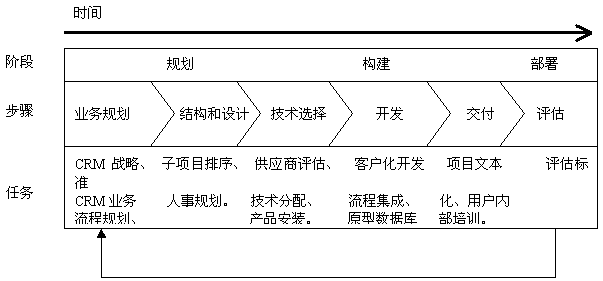 CRM規(guī)劃圖包括三個主要的項(xiàng)目開發(fā)階段:規(guī)劃、構(gòu)建、部署;它還以“分布驟”為特色,包括許多固定的和可變的任務(wù),簡單介紹如下: