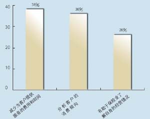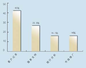 關于所應用的CRM類型,有5家是呼叫中心,5家是分析型,7家是運營型,2家是屬于大型企業(yè)CRM。其中13家擁有動態(tài)客戶數(shù)據(jù)庫,占到68.4%。這其中又有42%利用數(shù)據(jù)庫作客戶記錄,26.3%作為客戶支持使用,15.7%用作統(tǒng)計分析,另有16%作為市場推廣。保險公司與客戶聯(lián)系的方式,從重要性來看依次為:面對面\電話\網(wǎng)絡\傳真,這說明保險公司對于與客戶進行人性化交流的重視。在問到CRM的主要作用時,有5家表示使用CRM有助于保險業(yè)了解自身的經(jīng)營情況,幫助公司準確地發(fā)現(xiàn)贏利客戶和具有贏利潛力的客戶,有7家認為使用CRM有助于分析客戶的消費傾向,有7家認為使用CRM有助于優(yōu)化信息和資源管理。在問到是否愿意為像CRM系統(tǒng)這樣的咨詢或服務付費時,有11家表示愿意,占到57.8%。