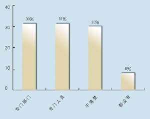 在問到實施周期上,有9家表示希望在3個月內(nèi)完成,占到47.4%,有6家接受3~6個月的周期,超過6個月的周期已經(jīng)顯得太長。在問到CRM的實施效果上,有9家認為對公司運營效率有很大提高,8家認為作用一般,只有2家認為沒有作用。表明基本上企業(yè)認可CRM的作用。在問到是否有專門人員負責CRM時,有6家表示有專門部門,有6家有專門人員,合計占62%,說明企業(yè)非常重視CRM的應用。