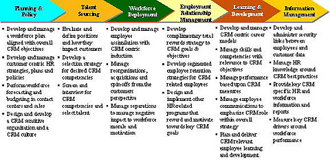 從工作的組織方法到人員雇用,再到一個(gè)角色如何影響客戶的工作描述、根據(jù)對公司確立CRM的貢獻(xiàn)如何進(jìn)行獎勵、雇員發(fā)展、管理勞動力信息等等,統(tǒng)統(tǒng)都是成功CRM的一部分。