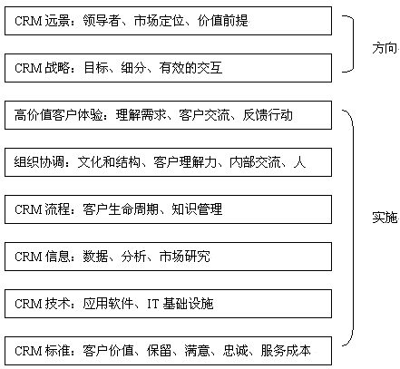 對于大多數(shù)公司而言,一個產(chǎn)品戰(zhàn)略很好理解。但是CRM戰(zhàn)略卻不太讓人理解。這是因為在CRM產(chǎn)業(yè)界、學術界對"CRM是什么"、"CRM戰(zhàn)略由什么組成"還沒有達成共識。因此,以下所闡述的CRM戰(zhàn)略并不一定勝人一籌,但我們會努力全面論述CRM戰(zhàn)略框架。我們認為一個CRM戰(zhàn)略必須包括以下幾個內(nèi)容:定義價值前提、定義客戶戰(zhàn)略、企業(yè)變革計劃。