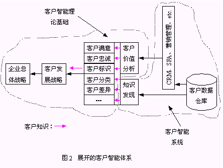 brains behind CRM)。二、圍繞客戶智能的實現(xiàn)的研究。Jim Berkowitz提出"商業(yè)智能是CRM的基礎(chǔ)"的觀點。另一個難得可貴的地方是該研究對商業(yè)智能包括的組件進(jìn)行了分析,將OLAP、數(shù)據(jù)倉庫、數(shù)據(jù)挖掘技術(shù)作為商業(yè)智能的必備組件。三、與客戶智能密切相關(guān)的研究。Emma