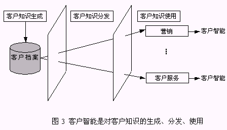 客戶知識是人們通過實踐認(rèn)識到的、與客戶有關(guān)的規(guī)律性,而客戶智能是獲得客戶知識并使用客戶知識求解問題的能力?蛻糁悄苁菍ζ髽I(yè)戰(zhàn)略決策真正有價值的事物和行動?蛻糁悄懿粌H包括了客戶知識的生成,而且更強調(diào)了客戶知識在企業(yè)中的分發(fā)、使用,直到產(chǎn)生客戶智能。所以,客戶智能是對客戶知識的生成、分發(fā)和使用(圖3)。