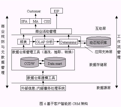 圖6是本文給出的以客戶智能為核心的I-CRM系統(tǒng)架構(gòu)。從數(shù)據(jù)源層來的客戶數(shù)據(jù)經(jīng)過ETL(抽取、轉(zhuǎn)換、裝載)、清洗后以數(shù)據(jù)存儲層的CCDW或數(shù)據(jù)集市的形式存儲。應(yīng)用支持層是提供了報表查詢、OLAP、知識發(fā)現(xiàn)分析決策工具,作用于客戶數(shù)據(jù),該過程產(chǎn)生的有價值的客戶知識存儲于動態(tài)知識庫中。互動層提供了I-CRM利用客戶知識從而有效實施其功能的場所。該架構(gòu)具有以下特點: