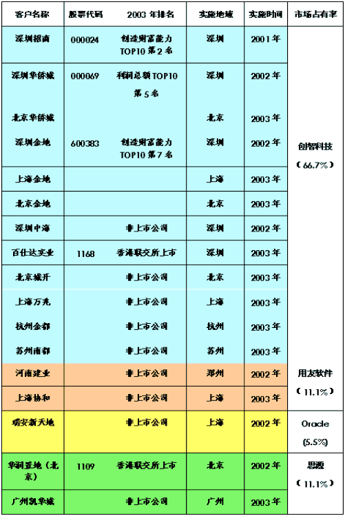 在國(guó)務(wù)院發(fā)展研究中心企業(yè)研究所、清華大學(xué)房地產(chǎn)研究所和搜房研究院共同發(fā)起評(píng)比的"中國(guó)房地產(chǎn)TOP10"中已經(jīng)有3家企業(yè)導(dǎo)入CRM,它們是:居財(cái)富創(chuàng)造能力TOP10第2位的深圳招商;居利潤(rùn)總額TOP10第5位的深圳華僑城;居財(cái)富創(chuàng)造能力TOP10第7位的深圳金地。截止2003年10月底,只有創(chuàng)智科技公司為"中國(guó)房地產(chǎn)TOP10"提供了房地產(chǎn)CRM解決方案。