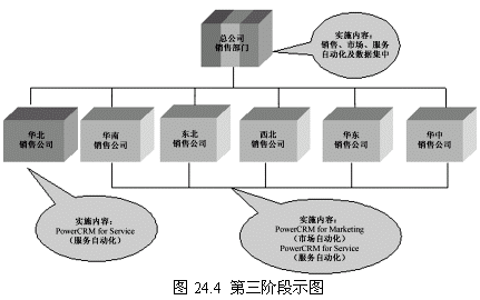 這一階段首先確立一個點(華北銷售公司),這個點的選擇要考慮多方面的因素,比如員工素質(zhì)、電腦應用水平以及基礎(chǔ)設(shè)施等。第一階段目標的實現(xiàn)對整個項目關(guān)系重大,是一個示范性的實施,對維持管理層和員工對CRM項目的信心具有重要的意義。
