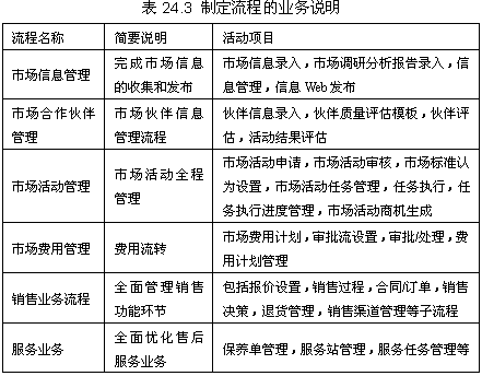 根據(jù)CRM軟件的總體目標(biāo),項(xiàng)目組詳細(xì)審核每個業(yè)務(wù)的流程,并按照流程對軟件進(jìn)行定制。所制定的流程包括三大業(yè)務(wù)領(lǐng)域的業(yè)務(wù),見表24.3。