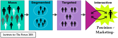 首先,互聯(lián)網(wǎng)的出現(xiàn)改變了營(yíng)銷的概念,為大規(guī)模定制創(chuàng)造了空前的機(jī)遇。隨著富裕而又有辨別能力的中產(chǎn)階級(jí)的逐漸壯大,預(yù)先營(yíng)銷的期望以及針對(duì)個(gè)人的解決方案日益成為一種標(biāo)準(zhǔn)。從記住他們的行為&偏好并為他們發(fā)送相關(guān)產(chǎn)品信息 (例如Amazon.com) …到幫助他們得到自己理想中的產(chǎn)品 (例如Dell.com,) ,CRM觀念的關(guān)鍵之處就在于為客戶提供符合他們需求的產(chǎn)品/服務(wù)而不是向他們推銷你的東西。互聯(lián)網(wǎng)使你能夠與客戶建立學(xué)習(xí)關(guān)系,從銷售轉(zhuǎn)移到解決問(wèn)題。互聯(lián)網(wǎng)上的CRM已經(jīng)上升到了另一個(gè)高度。