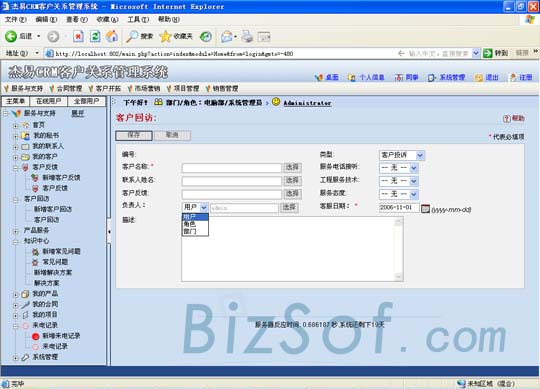 頁(yè)面的最頂端將本系統(tǒng)分為服務(wù)與支持、合同管理、客戶開(kāi)拓、市場(chǎng)營(yíng)銷、項(xiàng)目管理、銷售管理六板塊進(jìn)行陳列以方便管理,同時(shí)左側(cè)是詳細(xì)的樹(shù)形結(jié)構(gòu)圖,所有功能一目了然。本系統(tǒng)實(shí)現(xiàn)了將不同業(yè)務(wù)、客服人員涉及的客戶資料進(jìn)行了全面而且條理的整理匯集,整合團(tuán)隊(duì)的力量提供完善的服務(wù)。