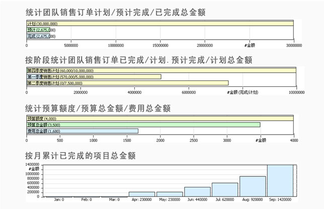 在VamCRM項(xiàng)目組合管理中集成項(xiàng)目數(shù)據(jù)的統(tǒng)計(jì)與分析,可以直接監(jiān)控項(xiàng)目計(jì)劃、預(yù)計(jì)及完成的項(xiàng)目數(shù)量、總金額和費(fèi)用的統(tǒng)計(jì),也可按月累計(jì)已完成的項(xiàng)目數(shù)量、總金額和費(fèi)用,直接衡量項(xiàng)目實(shí)施的結(jié)果與效益。在費(fèi)用管理模塊中集成費(fèi)用數(shù)據(jù)的統(tǒng)計(jì)與分析,對(duì)于所有費(fèi)用可以按人及費(fèi)用類(lèi)型進(jìn)行統(tǒng)計(jì),實(shí)時(shí)知道哪一個(gè)人或哪一類(lèi)費(fèi)用開(kāi)銷(xiāo)最多,以及費(fèi)用與預(yù)算的對(duì)比分析。