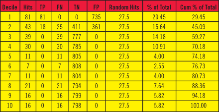 Decile-分組序號;Hits-命中數(shù),即每組內(nèi)包含的實際響應(yīng)數(shù),等于TP+FN;
