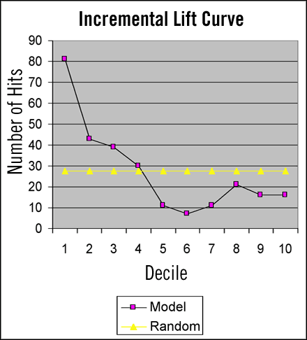 在增量提升曲線中標(biāo)示了各個分段的命中數(shù)。 在圖1中可以看到,增量提升曲線在第4個分段后和隨機(jī)期望線(275個響應(yīng)的10%,即平均每個分段27.5個響應(yīng))交叉。