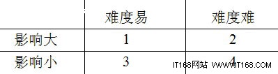 在實際工作中,筆者一般都會將用戶的需求進(jìn)行分類。如下圖所示,筆者會按兩個角度對需求進(jìn)行歸類,分別按難度與影響程度進(jìn)行區(qū)分。如根據(jù)難度可以將需求分為容易實現(xiàn)和實現(xiàn)起來比較困難兩個級別。而根據(jù)影響程度可以將需求分為影響大和影響小兩類。