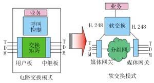 在電路交換網中,呼叫控制、業(yè)務提供以及交換矩陣均集中在一個交換系統(tǒng)中,而軟交換的主要設計思想是業(yè)務/控制與傳送/接入分離,各實體之間通過標準的協(xié)議進行連接和通信,以便在網上更加靈活地提供業(yè)務,見圖1。更具體地講,軟交換是一個基于軟件的分布式交換/控制平臺,它將呼叫控制功能從網關中分離出來,開放業(yè)務、控制、接入和交換間的協(xié)議,從而真正實現(xiàn)多廠家的網絡運營環(huán)境,并可以方便地在網上引入多種業(yè)務。