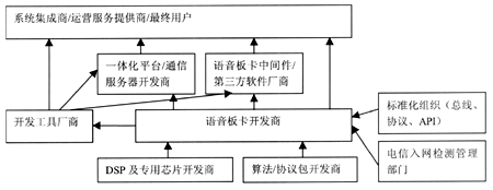 。。CTI板卡是插在計(jì)算機(jī)總線上,用于電話接口及有關(guān)處理的計(jì)算機(jī)板卡,又稱“語音卡”。語音卡是CTI系統(tǒng)中關(guān)鍵的硬件設(shè)備,它使得計(jì)算機(jī)和電話快速、緊密地結(jié)合在一起。CTI板卡不僅是一種產(chǎn)品,它已經(jīng)發(fā)展成為了一個產(chǎn)業(yè)。CTI板卡的產(chǎn)業(yè)鏈條所涉及的廠商和組織,如圖所示。