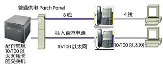 第二種方式是,在局域網(wǎng)交換機(jī)和電話機(jī)之間增加一個(gè)專用供電設(shè)備,一邊是多路普通網(wǎng)絡(luò)線從局域網(wǎng)交換機(jī)接入,另一邊則是增加了供電的多路網(wǎng)絡(luò)線,接出到IP電話機(jī)。這種設(shè)備一般安置在機(jī)房,只是增加了機(jī)房?jī)?nèi)的網(wǎng)線排列。如下圖: