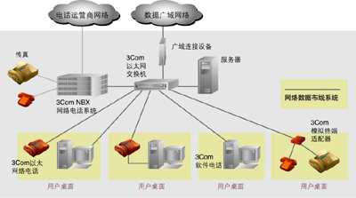 SuperStack 3 NBX V5000交換系統(tǒng)作為網(wǎng)絡(luò)話音核心交換系統(tǒng),該系統(tǒng)內(nèi)置了自動(dòng)話務(wù)員、語音消息系統(tǒng)等。而桌面則采用3Com 10/100Mbps以太網(wǎng)絡(luò)電話終端,同時(shí)采用3Com