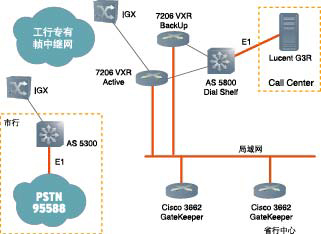 AS 5800 Dial Shelf上的E1接口直接連接客戶(hù)服務(wù)中心的Lucent公司G3R交換機(jī)。市行的語(yǔ)音網(wǎng)關(guān)Cisco AS 5300同樣通過(guò)高速串口接入幀中繼網(wǎng)絡(luò),與本地網(wǎng)絡(luò)完全隔離。市行申請(qǐng)的95588數(shù)字中繼線路(多采用ISDN