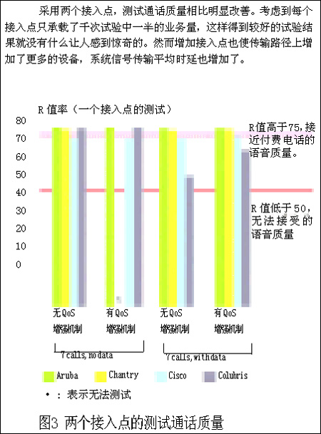 而其他供應(yīng)商的設(shè)備在開啟QoS保障機(jī)制的情況下,一旦加入數(shù)據(jù)流業(yè)務(wù),就很難保證通話質(zhì)量。從正面來看,在只有語音傳輸業(yè)務(wù)的情況下,QoS保障機(jī)制一般運(yùn)行較好。當(dāng)我們只承載語音傳輸時(shí),所有系統(tǒng)的音頻質(zhì)量都改善了。在不加入數(shù)據(jù)流情況下測試6個(gè)或7個(gè)并行VoIP呼叫,所有的系統(tǒng)都能夠取得和付費(fèi)電話一樣的通話質(zhì)量。但當(dāng)我們加入數(shù)據(jù)流業(yè)務(wù),一切都改變了。在承載6個(gè)并行VoIP呼叫并加入數(shù)據(jù)流業(yè)務(wù)的情況下,Colubris CN1250系統(tǒng)的R值衰落到70以下。根據(jù)ITU的R值標(biāo)準(zhǔn),這說明一些用戶的通話質(zhì)量不令人滿意。Chanrty的R值在60左右,這個(gè)結(jié)果將不能令用戶滿意。除了客觀的R值評分以外,我們還進(jìn)行了一些主觀的通信質(zhì)量監(jiān)聽,當(dāng)加入了數(shù)據(jù)流業(yè)務(wù)以后,我們聽到了大量的回聲,掉線頻繁。總之,只要測試點(diǎn)加入數(shù)據(jù)業(yè)務(wù)流,上面描述的情況就會出現(xiàn),通話質(zhì)量通常變得惡劣。