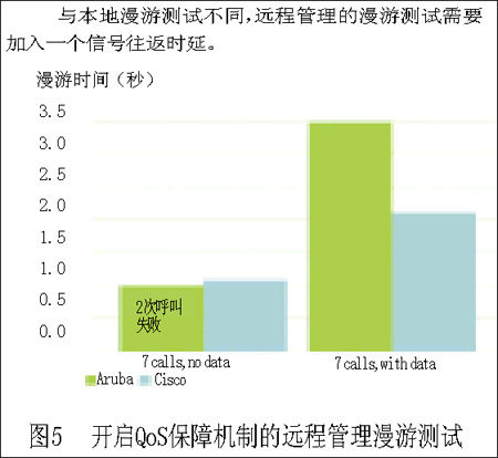 Aruba公司的設(shè)備在漫游測試中表現(xiàn)出色,它的平均漫游切換時(shí)間在0.5~1秒之間,雖然這已經(jīng)是所有的測試設(shè)備中表現(xiàn)最好的,但是通話者還是能夠察覺這種時(shí)延。而Cisco公司的設(shè)備,由于時(shí)間的限制,我們只進(jìn)行了7個(gè)并行呼叫的漫游測試,平均漫游時(shí)間為0.433秒到1.053秒,而加入數(shù)據(jù)流業(yè)務(wù)時(shí),在7個(gè)并行VoIP呼叫時(shí),系統(tǒng)的時(shí)延達(dá)到了4.324秒。
