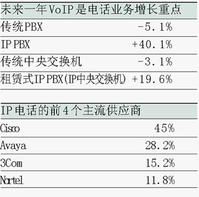 事實上,北美市場的實際銷售量已經(jīng)表明,市場中的傳統(tǒng)語音交換機銷售量已經(jīng)在明顯下降,而具備IP功能或純IP系統(tǒng)的銷售量卻在穩(wěn)步上升。Gartner 預(yù)計,2005年在北美地區(qū)銷售的純IP系統(tǒng)總價值將高達(dá)9.03億美元,比2004年的6.86億美元上升32%。同時,傳統(tǒng)電路交換系統(tǒng)的銷售量將從2004年的14億美元下降至9.99億美元,下降的幅度是32%。而混合式系統(tǒng)的銷量增長幅度可望達(dá)到30%,也就是說,從2004年的1.5億美元增長到2005年的2億美元。