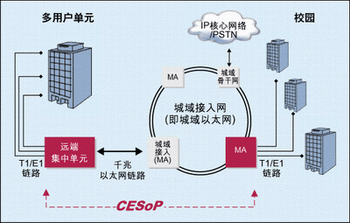 對于擁有眾多用戶的樓宇或校園業(yè)務(wù),運(yùn)營商可能需要在靠近客戶的地方裝設(shè)遠(yuǎn)端集中器。遠(yuǎn)端集中器集中提供給該樓宇內(nèi)客戶的TDM和/或分組業(yè)務(wù),使用電路仿真并通過點到點連接將業(yè)務(wù)傳回最近的城域網(wǎng)絡(luò)接入點。