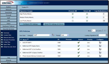 SonicWALL入侵檢測服務(wù)(IPS)能夠為VoIP協(xié)議應(yīng)用層提供全面保護(hù)。IPS集成了一個可配置的超高性能掃描引擎,配合動態(tài)更新和擁有1900多攻擊和漏洞簽名的數(shù)據(jù)庫,可以保護(hù)網(wǎng)絡(luò)免受最復(fù)雜的木馬和變形威脅的影響。SonicWALL已經(jīng)利用一系列VoIP相關(guān)的簽名來擴(kuò)展其IPS簽名數(shù)據(jù)包,可以防止惡意業(yè)務(wù)流到達(dá)受保護(hù)的VoIP電話和服務(wù)器。