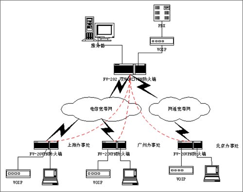 VPN防火墻網(wǎng)關(guān)具有雙WAN口和QOS帶寬管理功能,總部同時(shí)接入兩條ADSL線路,通過(guò)策略路由,把內(nèi)部網(wǎng)絡(luò)的上網(wǎng)訪問(wèn)全部從WAN2的ADSL上網(wǎng),而把VOIP和VPN全部通過(guò)WAN1的ADSL來(lái)傳輸,從而避免了上網(wǎng)的請(qǐng)求占用VPN和VOIP的帶寬。同時(shí),通過(guò)對(duì)內(nèi)部網(wǎng)絡(luò)不同的業(yè)務(wù)劃分不同的優(yōu)先級(jí),特別是把VOIP的優(yōu)先級(jí)做為最高,優(yōu)先轉(zhuǎn)發(fā)VOIP的數(shù)據(jù)包,同時(shí)又通過(guò)VOIP和VPN傳輸分配最大和最小的保證帶寬,來(lái)保護(hù)VOIP業(yè)務(wù)的正常通信。除此之外,F(xiàn)V-202強(qiáng)大的訪問(wèn)控制功能,特別是對(duì)VPN隧道的訪問(wèn)控制功能,可以對(duì)各地的分公司通過(guò)VPN訪問(wèn)總公司的服務(wù)器進(jìn)行控制,為不同的客戶分配不同的權(quán)限,讓遠(yuǎn)程的VPN隧道只能訪問(wèn)指定的IP地址或相關(guān)的業(yè)務(wù)端口,能很好保證VPN的訪問(wèn)安全。特別值得一提的是,F(xiàn)V-202支持網(wǎng)通、電信雙線路接入,如果由于北方網(wǎng)通跨網(wǎng)接入,可以在全部申請(qǐng)網(wǎng)通線路,把北方的分支機(jī)構(gòu)接入到總部的網(wǎng)通線路,可以避免由于跨網(wǎng)帶來(lái)的帶寬瓶頸。在各個(gè)分支機(jī)構(gòu)配置iRouter的FV-20VPN防火墻,為各個(gè)分支機(jī)構(gòu)構(gòu)建一道安全的防線,實(shí)現(xiàn)與總部的VPN的聯(lián)接。同時(shí),外出的員工或領(lǐng)導(dǎo)通過(guò)IPSEC的撥號(hào)軟件,實(shí)現(xiàn)移動(dòng)的接入,通過(guò)VPN,東莞奧愛(ài)斯構(gòu)建全國(guó)的融合的安全通信平臺(tái),既可以解決VOIP的被竊聽(tīng)的風(fēng)險(xiǎn),又能實(shí)現(xiàn)實(shí)時(shí)的數(shù)據(jù)訪問(wèn)。從而大大地降低公司長(zhǎng)途的話費(fèi)和以往租用數(shù)據(jù)專線的高昂的費(fèi)用,提高了公司的工作效率,為公司帶來(lái)十分明顯的經(jīng)濟(jì)效益。