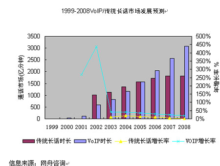 2000年以來,IP長話憑借明顯的資費(fèi)優(yōu)勢(shì),對(duì)傳統(tǒng)長話形成了有力的競(jìng)爭(zhēng),在通話量上已趕超了傳統(tǒng)長話。也正是由于IP長話的低資費(fèi),在其通話量大幅度增加的同時(shí),也導(dǎo)致了國內(nèi)長話網(wǎng)總體收入的下降,長途電話IP化的趨勢(shì)十分明顯?傮w而言,中國VoIP市場(chǎng)仍蘊(yùn)藏著非常大的潛力,按照3G和NGN的部署速度,