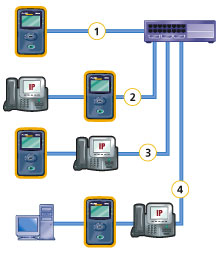 下面所顯示的四個測試位置支持包括VoIP網(wǎng)絡測試、監(jiān)測和故障診斷能力的完整的VoIP周期:在電話安裝前、電話安裝后以及將 NetTool 與電話串聯(lián)在一起。