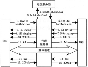URI地址,建議利用DNS系統(tǒng),解析該地址得到該域中SIP代理服務(wù)器地址,信令到達該服務(wù)器后,再查詢該域中的位置登記服務(wù)器,即可定位到被叫用戶當前所在地址。
