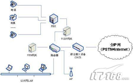 IP-PBX或者分組語音交換(PVX),以及綜合接入設(shè)備(IAD),從而取代傳統(tǒng)的PBX和終端。IAD通常支持基于DSL的業(yè)務(wù),因此部署時(shí)不需要多個(gè)物理線路的開銷,因?yàn)橐粭l來自IAD的物理線路能夠支持多個(gè)虛擬電路。PVX可以處理各種分組話音服務(wù),而且可以避免升級(jí)和互操作性的問題。