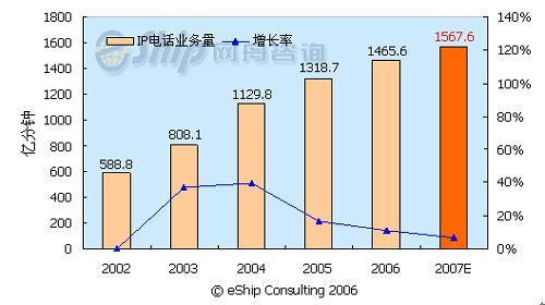 從圖中可以看出,國內(nèi)IP電話市場近年呈現(xiàn)出快速增長趨勢,2002-2007年年均增長率為20.7%。預(yù)計2007年IP電話的通話時長將達(dá)到1567.6億分鐘,同比增長7%。但從2005年開始,IP電話的增長率呈下降趨勢,這主要是受管制限制和移動長途的替代作用所致。