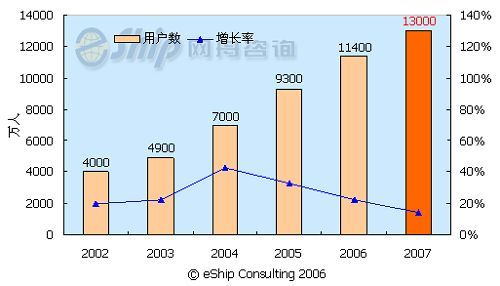 從圖中可以看出,國內(nèi)即時通訊用戶數(shù)保持了較快的發(fā)展速度,從 2002-2006年年均增長率為26.6%,到2007年國內(nèi)即時通訊用戶數(shù)將達(dá)到1.3億。