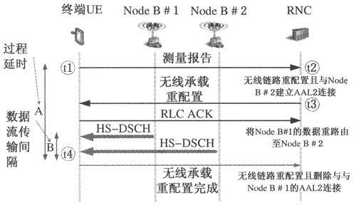 圖2中,傳輸時(shí)間間隔用時(shí)刻B表示,該時(shí)間可以忽略,因?yàn)閁E從源小區(qū)到目標(biāo)小區(qū)的切換是與網(wǎng)絡(luò)同步的。因此,對于像VoIP這樣的低延時(shí)實(shí)時(shí)業(yè)務(wù)來說,HSPA可以提供無縫的移動性。