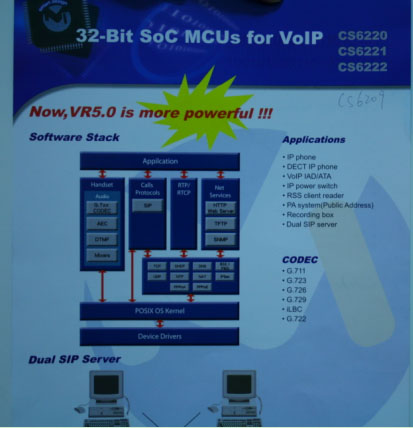 網(wǎng)關(guān)器及IP PBX應(yīng)用的市場的產(chǎn)品包括CS6209、CS6220、CS6221、CS6222、CS6223等,并提供了非常完善的解決方案。為了更好的服務(wù)于大陸客戶,目前,世紀(jì)民生在大陸的深圳、武漢和上海都設(shè)有分公司,并且在各分公司之間已經(jīng)在穩(wěn)定的使用VoIP來進(jìn)行溝通。