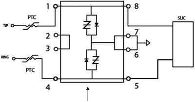 FXS要求SLIC保護器能夠將多余的浪涌轉移到SLIC T/R線路中。這是利用P1101DF-1的單向特性完成的。線路中出現(xiàn)的正浪涌將被反并聯(lián)二極管轉移到SIDACtor