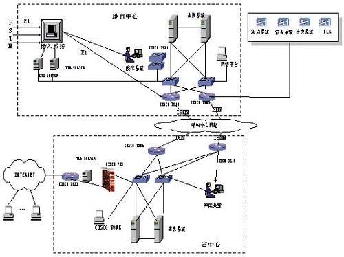 1924和中心交換機互聯(lián);在廣域網(wǎng)上,各地市和省中心通過2M DDN線路實現(xiàn)互聯(lián),通過ISDN線路實現(xiàn)線路備份,考慮到WEB受理的需要,全省呼叫中心系統(tǒng)設(shè)置統(tǒng)一的WEB服務(wù)器,設(shè)在省中心,通過CISCO