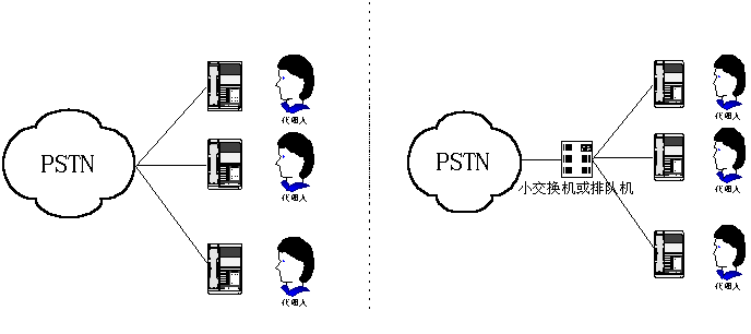 呼叫中心,早期是指一個由兩人或更多人組成的、在一個特定地方用專用設備處理電話業(yè)務的小組。這些人就是通常所說的呼叫中心代理(人)。一個呼叫中心可以只提供信息接收服務,或者只提供信息發(fā)送服務,或者是一個混合式呼叫中心,其呼叫中心代理會負責所有這兩項工作。從物理設備構(gòu)成來看,第一代呼叫中心可用下圖(1)、(2)表示。