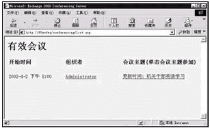 如果在前面已設(shè)置了提醒功能,那么在臨近會議前屏幕上將出現(xiàn)提醒窗口。教師機(jī)和學(xué)生機(jī)有三種方法可以參加會議:點(diǎn)擊提醒窗口中[參加會議]按鈕;或者不等提醒,直接點(diǎn)擊會議邀請函中的鏈接打開會議網(wǎng)頁;最好的方式還是打開IE,輸入網(wǎng)址http://x/conferencing/list.asp進(jìn)入會議(x為Exchange服務(wù)器的IP地址或計(jì)算機(jī)名),如圖3。